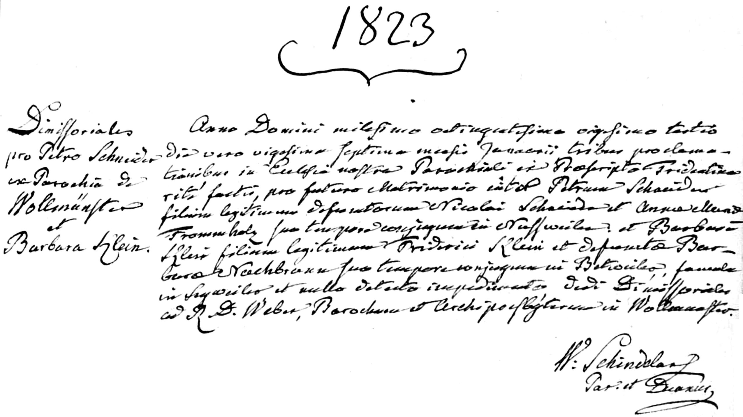 Parish marriage record for Pierre Schneider [I03180] and Barbe (Klein) Schneider [I03181]. Parents of the groom were Nicolas Schneider [I03208] and Anne Marie (Fromholtz) Schneider [I03209]. Parents of the bride were Frédéric Albin Klein [I03210] and Barbe (Nachbronn) Klein [I03211]. They were married 25 January 1823 at Nousseviller (Nussweiler in German). The main parish was apparently Medelsheim, Rheinland-Pfalz, just across the border in Germany.