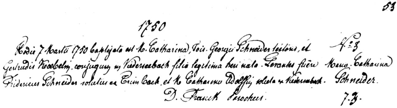 Source: Archives Départementles du Bas-Rhin (https://archives.bas-rhin.fr/) Trimbach - Registres Paroissiaux (Avant 1793) - Paroisse catholique (Avant 1793) - Registre de baptêmes 1731-1803 - 3 E 494/1, Baptism of Maria Catharina Schneider, Trimbach, 1750, Image 31 of 153, (https://archives.bas-rhin.fr/detail-document/ETAT-CIVIL-C490-P3-R256413#visio/page:ETAT-CIVIL-C490-P3-R256413-1824487 : downloaded 4 Apr 2023).