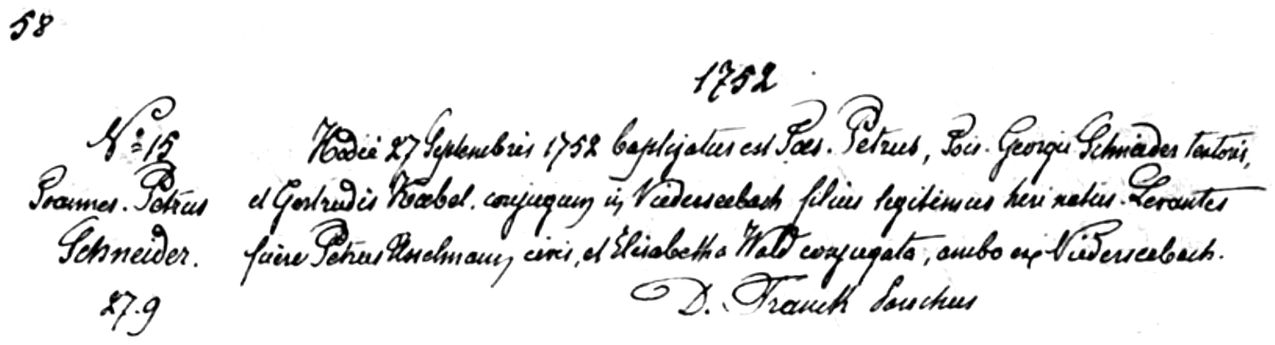 Source: Archives Départementles du Bas-Rhin (https://archives.bas-rhin.fr/) Trimbach - Registres Paroissiaux (Avant 1793) - Paroisse catholique (Avant 1793) - Registre de baptêmes 1731-1803 - 3 E 494/1, Baptism of Joannes Peter Schneider, Trimbach, 1752, Image 34 of 153, (https://archives.bas-rhin.fr/detail-document/ETAT-CIVIL-C490-P3-R256413#visio/page:ETAT-CIVIL-C490-P3-R256413-1824490 : downloaded 4 Apr 2023).