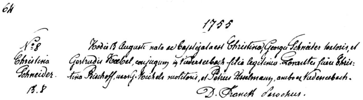 Christina Schneider [I03343], showing parents Joannes Georg Schneider [I03297] and Gertrude (Koebel) Schneider [I03298]. She was born and baptized 13 August 1755 in Trimbach.