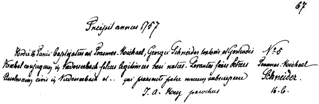 Source: Archives Départementles du Bas-Rhin (https://archives.bas-rhin.fr/) Trimbach - Registres Paroissiaux (Avant 1793) - Paroisse catholique (Avant 1793) - Registre de baptêmes 1731-1803 - 3 E 494/1, Baptism of Joannes Michael Schneider, Trimbach, 1757, Image 38 of 153, (https://archives.bas-rhin.fr/detail-document/ETAT-CIVIL-C490-P3-R256413#visio/page:ETAT-CIVIL-C490-P3-R256413-1824494 : downloaded 4 Apr 2023).