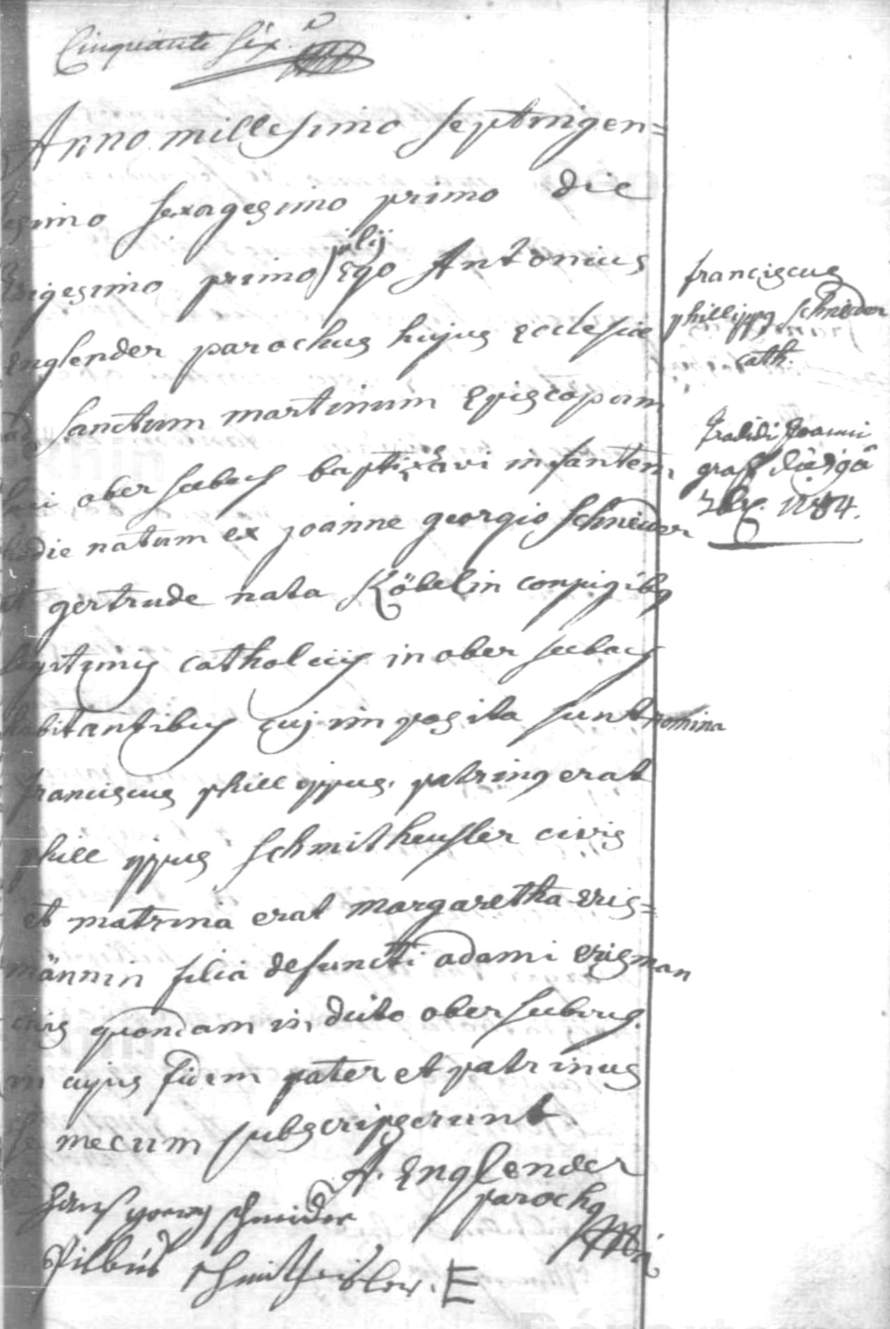 Source: Archives Départementles du Bas-Rhin (https://archives.bas-rhin.fr/) Oberseebach - Registres Paroissiaux (Avant 1793) - Paroisse catholique (Avant 1793) - Registre de baptêmes mariages sépultures 1756-1772 - 3 E 351/5, Baptism of Francis Phillip Schneider, Oberseebach, 1761, Image 58 of 307, (https://archives.bas-rhin.fr/detail-document/ETAT-CIVIL-C595-P3-R208893#visio/page:ETAT-CIVIL-C595-P3-R208893-2281243 : downloaded 5 Apr 2023).