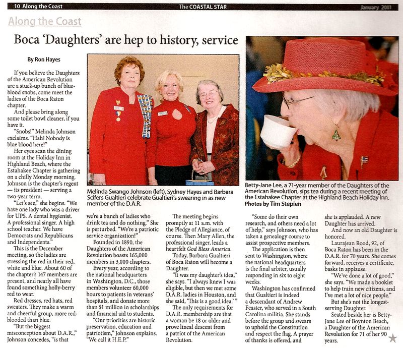 A newspaper article about the Boca Raton, Florida chapter of the Daughters of the American Revolution. Betty-Jane Lee is pictured and is mentioned as having been a member of the organization for 71 years.