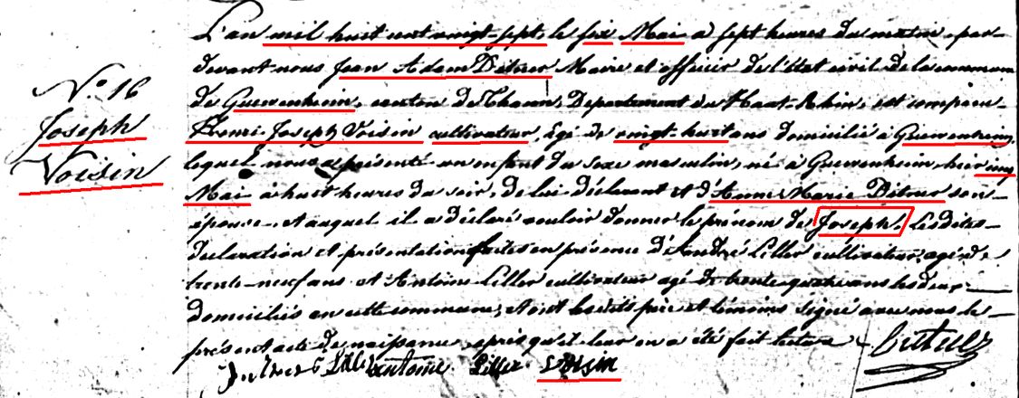 Source: "Etat Civil and Registres Paroissiaux," database, Departmental Archives of Haut-Rhin, Archives départementales du Haut-Rhin (http://www.archives.haut-rhin.fr/: Downloaded 10 December 2017), Guewenheim, Joseph Voisin, No. 16, 5 May 1827, image 117 of 382.