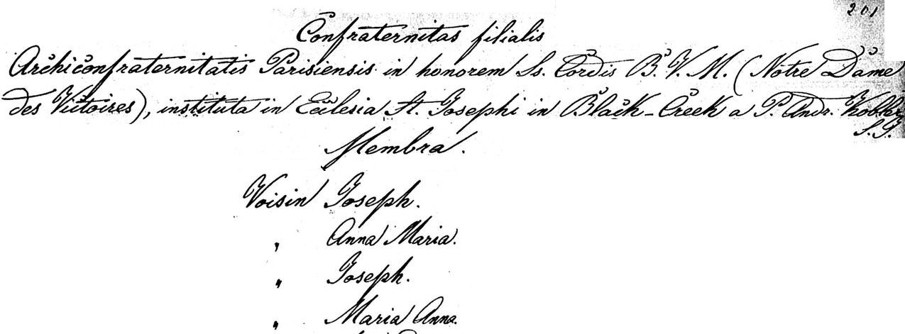 This is a list of members in a "Confraternitas filialis" or filial brotherhood at Saint Joseph's Catholic Church in Black Creek, more commonly known then as New Germany, and today as Snyder, Ontario. This is probably a group of parishioners devoted to prayer associated with the Notre-Dame-des-Victoires Basilica in Paris, France.