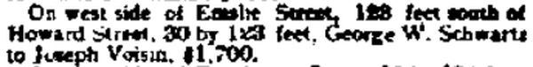 On west side of Emslie Street, 128 feet south of Howard Street, 30 x 123 feet, George W. Schwartz to Joseph Voisin, $1,700.