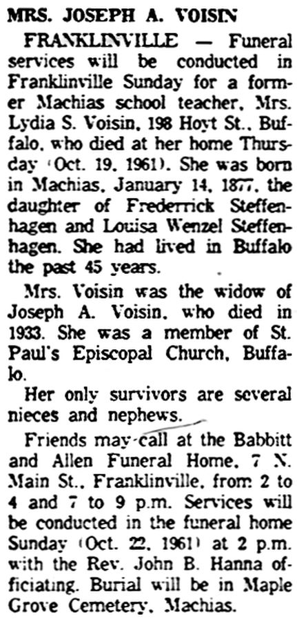 FRANKLINVILLE--Funeral services will be conducted in Franklinville Sunday for a former Machias school teacher, Mr.s Lydia S. Voisin, 198 Hoyt St., Buffalo, who died at her home Thursday (Oct 19, 1961). She was born in Machias, January 14, 1877, the daughter of Frederrick Steffenhagen and Louisa Wenzel Steffenhagen. She had lived in Buffalo the past 45 years.