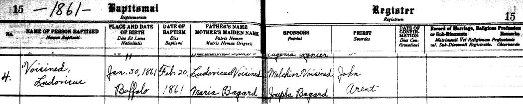 Source: St. Joseph (Buffalo, New York), Church Records, Baptisms, Ludovicus [Louis] Voisinet, 20 February 1861, Page 15, Number 4; FHL microfilm 1292854.