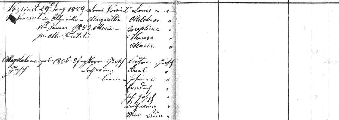 Source: St. Joseph (Buffalo, New York), Church Records, Family register, before 1864, Vincent and Magdalena (Hirsch) Voisinet; FHL microfilm 1292854.