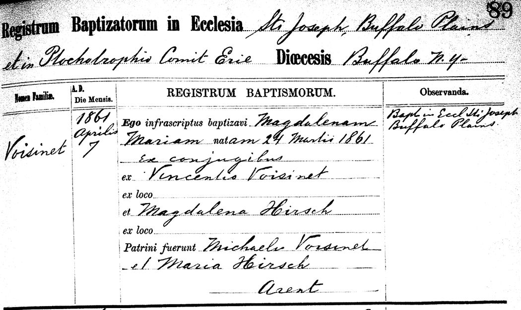 Source: St. Joseph (Buffalo, New York), Church Records, Baptisms, Magdalenam [Magdalena] Mariam [Maria] Voisinet, 7 April 1861, Page 89; FHL microfilm 1292854.