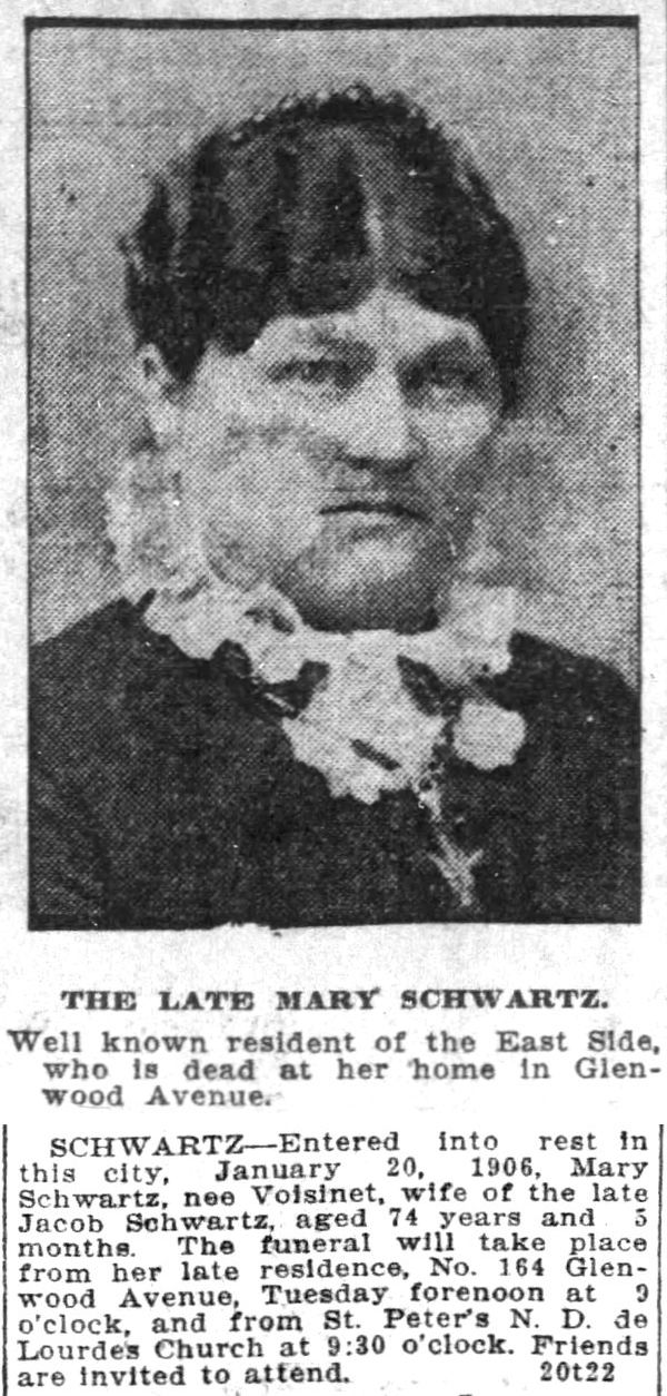 Source: "Obituary," Buffalo (New York) Times, 21 January 1906, The Late Mary Schwartz; online archives (http://newspapers.com : downloaded 21 November 2019). Page 22.