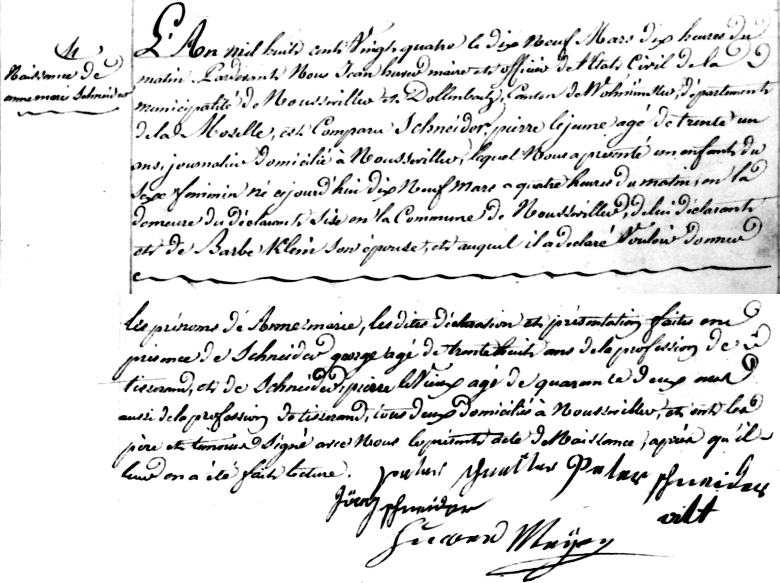 Source: Archives Moselle, (http://www.archives57.com/) Nousseviller-lès-Bitche, Registres paroissiaux et d'état civil, 9NUM/517EC1, Naissances, mariages, décès. (1793-1835), Birth of Anne Marie Schneider, 1824, Image 338 and 339 of 489 (downloaded 24 Apr 2023).