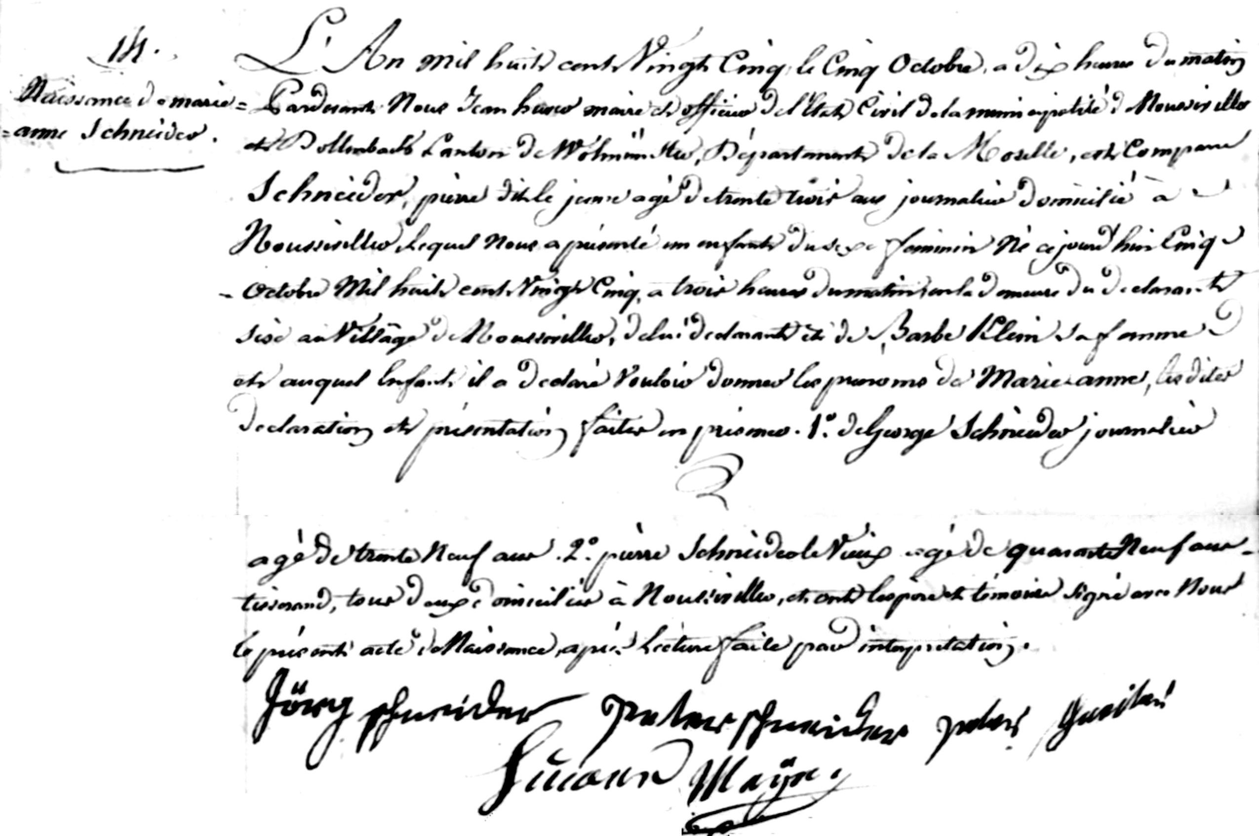 Source: Archives Moselle, (http://www.archives57.com/) Nousseviller-lès-Bitche, Registres paroissiaux et d'état civil, 9NUM/517EC1, Naissances, mariages, décès. (1793-1835), Birth of Marie Anne Schneider, 1825, Image 359 of 489 (downloaded 24 Apr 2023).