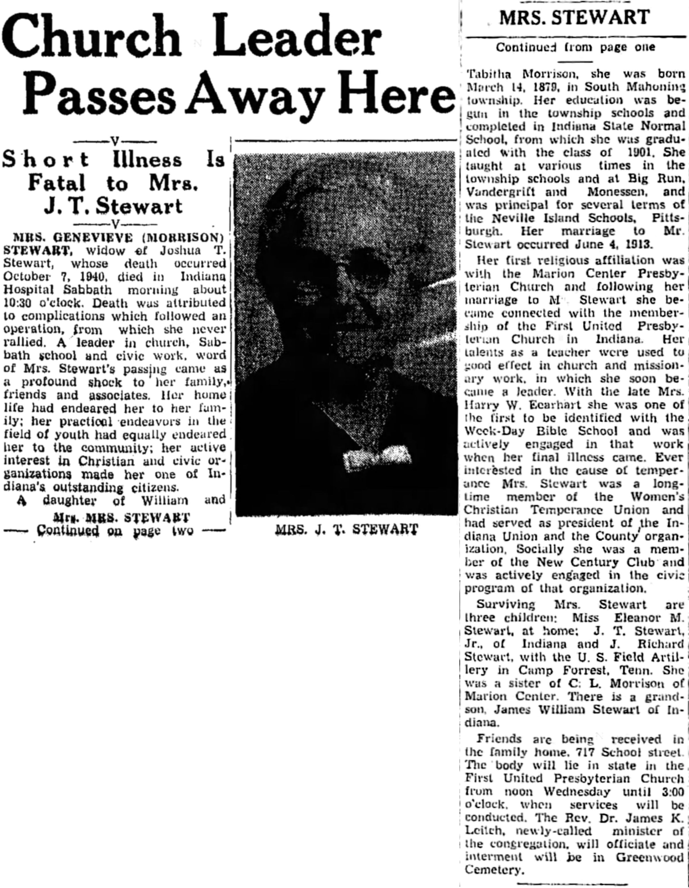 Mrs. Genevieve (Morrison) Stewart, widow of Joshua T. Stewart, whose death occurred October 7, 1940, died in Indiana Hospital Sabbath morning about 10:30 o'clock. Death was attributed to complications which followed an operation, from which she never rallied. A leader in church, Sabbath school and civic work, word of Mrs. Stewart's passing came as a profound shock to her family, friends and associates. Her home life had endeared her to her family; her practical endeavors in the field of youth had equally endeared her to the community; her active interest in Christian and civic organizations made her one of Indiana's outstanding citizens.