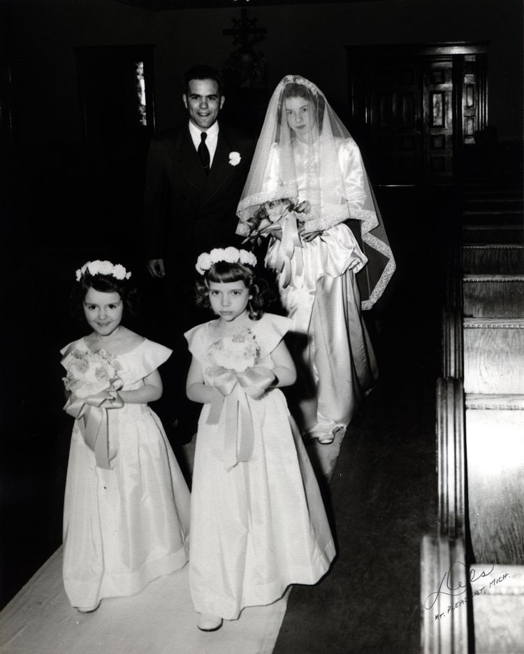 Ruth Phyllis (Stewart) Voisin [00002] and John Ernest Voisin [00001] in opening procession at their wedding ceremony, Sacred Heart Church, Mount Pleasant, Isabella, Michigan, January 8, 1949. Flower girls are Jack's niece Cora Sue (Downing) Grades and Jack's sister Katherine Ann Voisin.