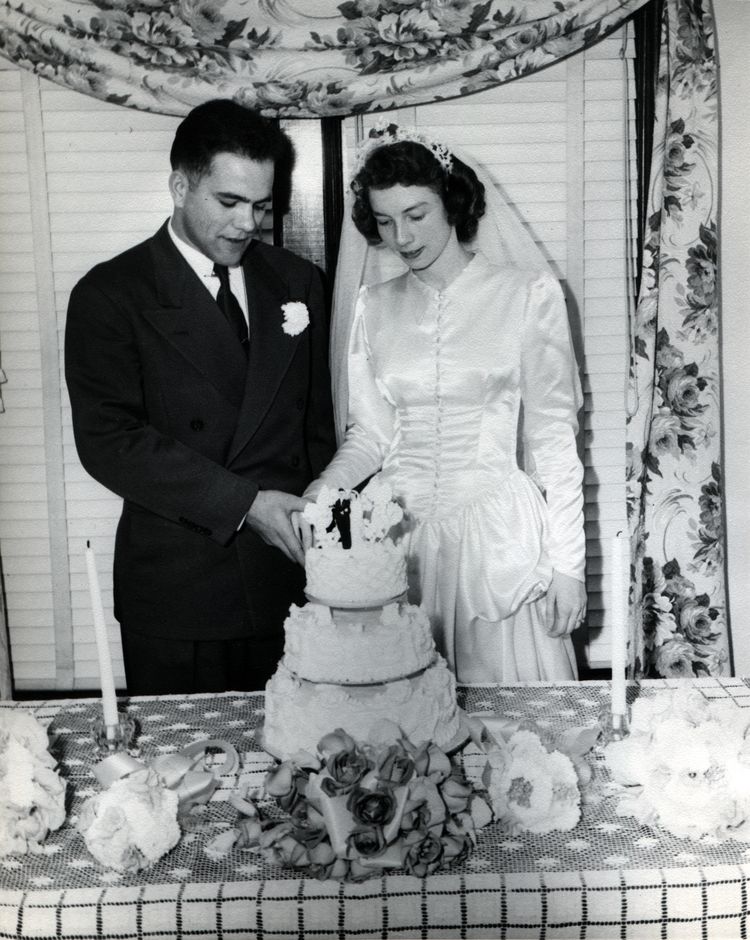 Ruth Phyllis (Stewart) Voisin [00002] and John Ernest Voisin [00001] at wedding reception, January 8, 1949.