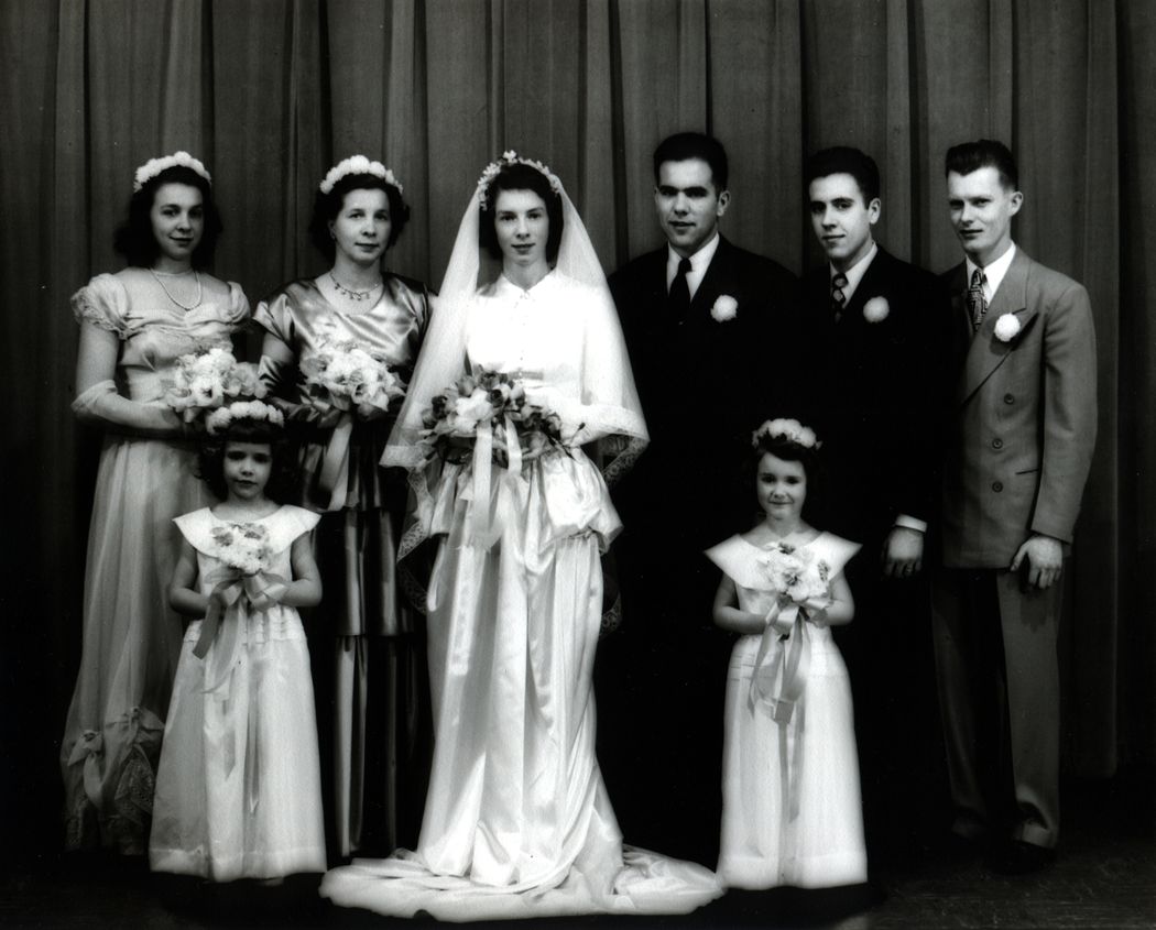 Wedding party for Ruth Phyllis (Stewart) Voisin [00002] and John Ernest Voisin [00001], January 8, 1949. From left to right, Ruth’s sister Letha Tressa (Stewart) Lotus, Ruth’s sister Mary Elizabeth (Stewart) McWhinney, Jack’s brother Glenn Arthur Voisin, and Jack’s brother-in-law Aaron B. Downing. The flower girls were Jack’s sister Katherine Ann “Karen” Voisin and Jack’s niece, Cora Sue Downing.