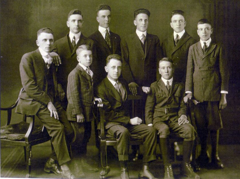 These are the nine sons of Joseph Voisin [00021] and Mary Ann (Yuncker) Voisin [00020]. Their daughters Irma and Henrietta are not present.