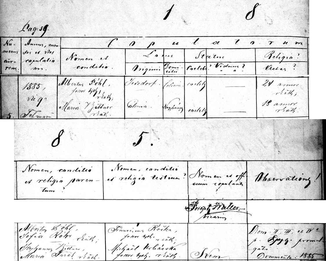 Marriage record for Albert G. "Béla" Pohl [I00546] and Mária "Mary" (Bittner) Pohl [I00547]. They were married February 9, 1885 near Pécs, Hungary.