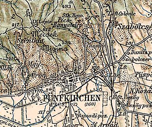 Excerpt from a map of the Third Military Mapping Survey of Austria-Hungary, probably published in 1910 although the map seems to be dated 1892. Shown is the vicinity of Fünfkirchen, Austria-Hungary (also known as Pécs). The town of Szabolcs (today known as Mecsekszabolcs) is to the northeast. Albert Pohl [00546] and Maria (Bittner) Pohl [00547] probably lived in or near Szabolcs, Hungary before emigrating to America in 1892 and 1893.