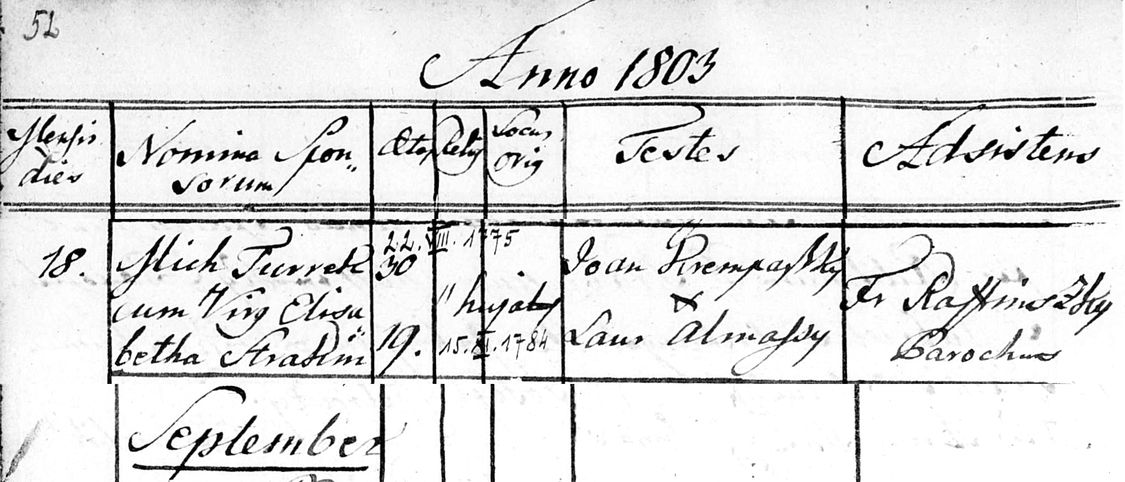 Marriage record for János Mihály Turek [I01939] and Erzsébet (Sztraka) Turek [I01940]. They were married August 18, 1803 in Szomolnok, Hungary. Also given is the baptism date of the groom, 22 August 1775, and of the bride, 15 November 1784.