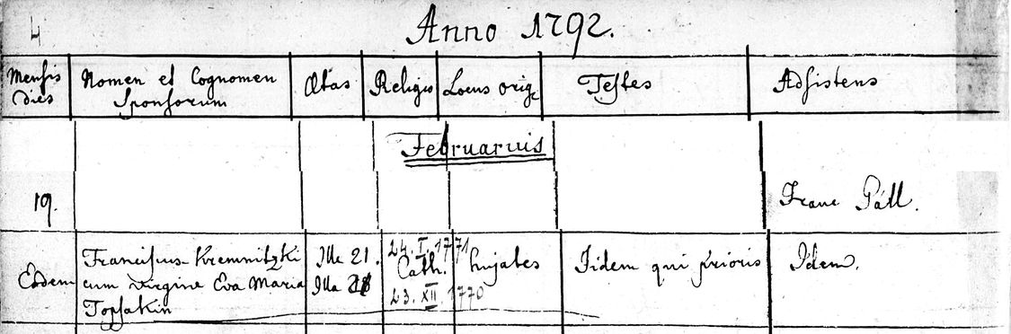 Marriage record for Ferenc Kremniczky [I01941] and Éva Mária (Topschak) Kremniczky [I01942]. They were married February 19, 1792 in Szomolnok, Hungary. Also given is the baptism date of the groom, 24 January 1771, and of the bride, 23 December 1770.