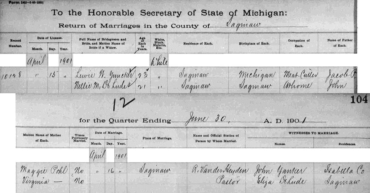 Source: "Michigan, Marriages, 1868-1925," index and images, FamilySearch ((https://familysearch.org/pal:/MM9.1.1/N38X-315: downloaded 19 March 2015), Lewis W. Yuncker and Nellie M. Delude, 16 Apr 1901; Saginaw, Saginaw, Michigan, Department of Vital Records, Lansing, Volume 4, Page 104, Record 10128, FHL microfilm 2,342,519.