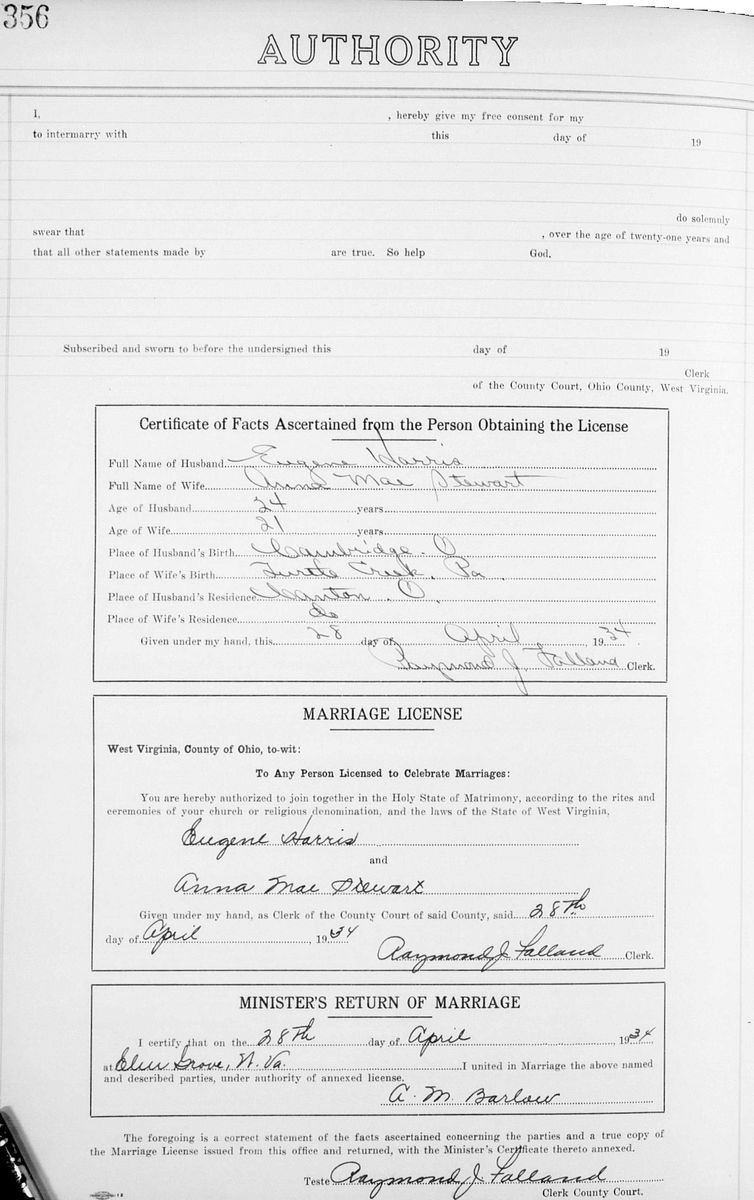 Source: West Virginia, Vital Research Records Project, Page 356, Eugene Harris, Cambridge, Ohio and Anna Mae Stewart, Turtle Creek, Pennsylvania, 28 April 1934; Digital images, West Virginia Division of Culture and History, West Virginia Archives and History (http://www.wvculture.org/vrr/ : downloaded 19 July 2016); West Virginia State Archives and the Genealogical Society of Utah.
