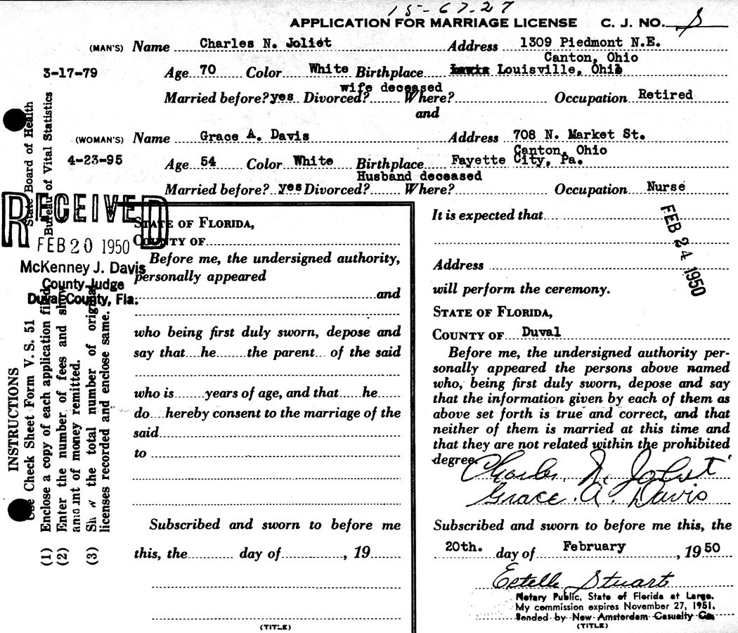 Marriage license application for Charles N. Joliet [I02418] and Grace A. (Davis) Joliet [I01914].