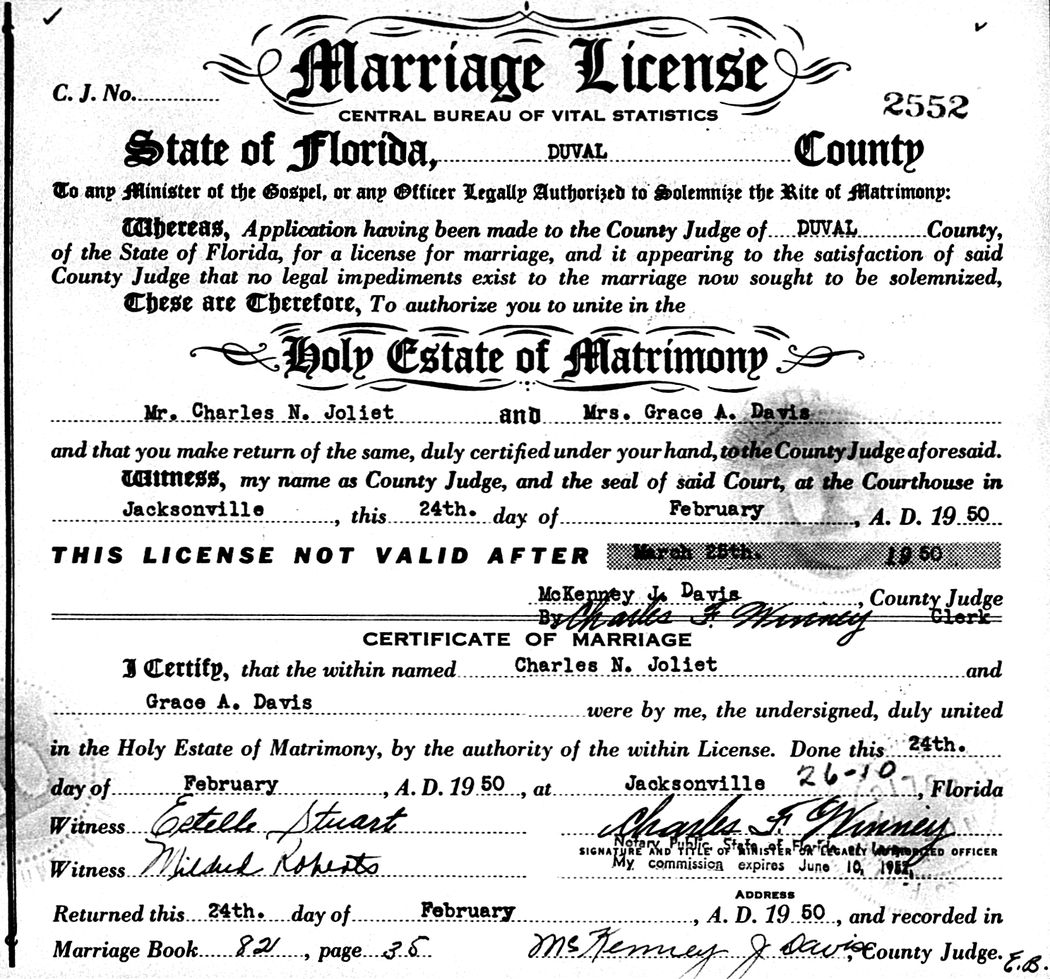 Source: "Florida Marriages, 1830-1993," database with images, FamilySearch (https://familysearch.org/ark:/61903/3:1:33S7-LBLC-YTG?cc=1803936&wc=4JHR-W6B%3A1601352304%2C1601362359 : 12 July 2019), Various > Marriage certificates, 1950, vol 1245-1254, cert no 1-5000 > image 2570 of 5035; citing multiple County Clerks of Court, Florida.