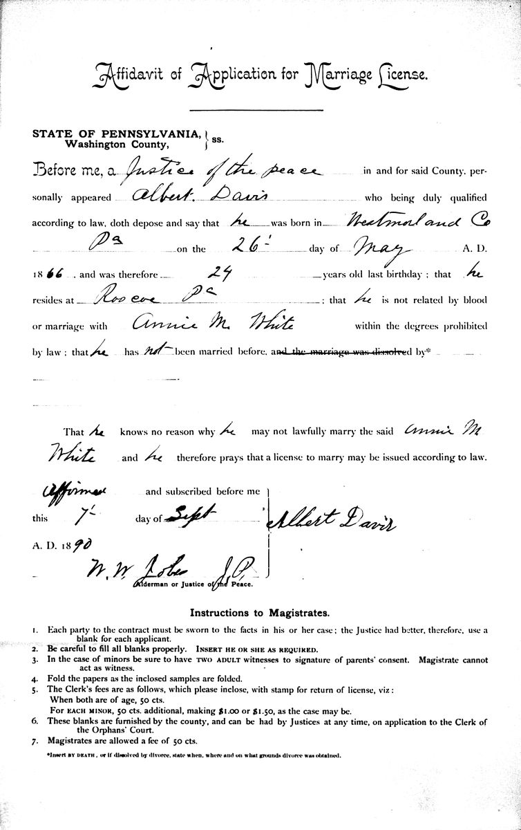 Source: "Marriage licenses, 1885-1951," index and images, FamilySearch (https://familysearch.org/: Downloaded 15 January 2020), Albert Davis and Annie M. White, Marriage license, no. 2156 - 2600 1890-1891; citing Washington County (Pennsylvania). Clerk of the Orphans' Court (Main Author).