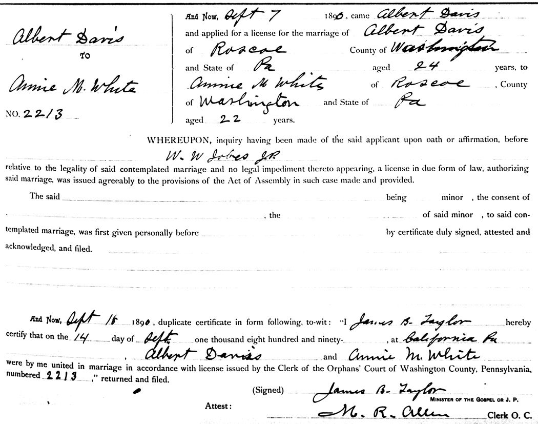 Source: "Marriage license dockets, 1885-1916; indexes to marriages, 1885-1940, Marriage dockets, v. 2 (p.250 to end) v. 3-4 (to p. 395) 1889-1893," index and images, FamilySearch (https://familysearch.org/: Downloaded 15 January 2020), Albert Davis to Annie M. White, #2213; citing Washington County (Pennsylvania). Clerk of the Orphans' Court (Main Author).