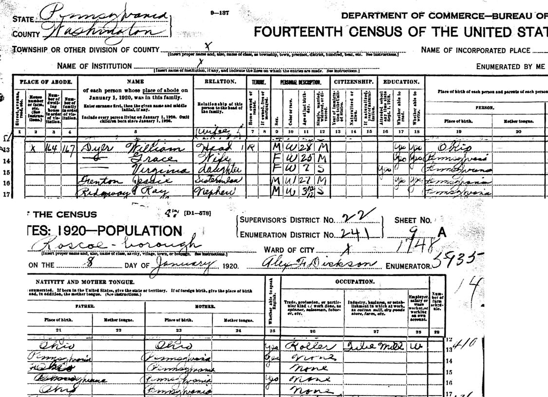 Source: Ancestry.com. 1920 United States Federal Census [database on-line]. Provo, UT, USA: Ancestry.com Operations, Inc., 2010. Images reproduced by FamilySearch. Original data: Fourteenth Census of the United States, 1920. (NARA microfilm publication T625, 2076 rolls). Records of the Bureau of the Census, Record Group 29. National Archives, Washington, D.C. William Dyer, Roscoe, Washington, Pennsylvania; Roll: T625_1660; Page: 9A; Enumeration District: 241.