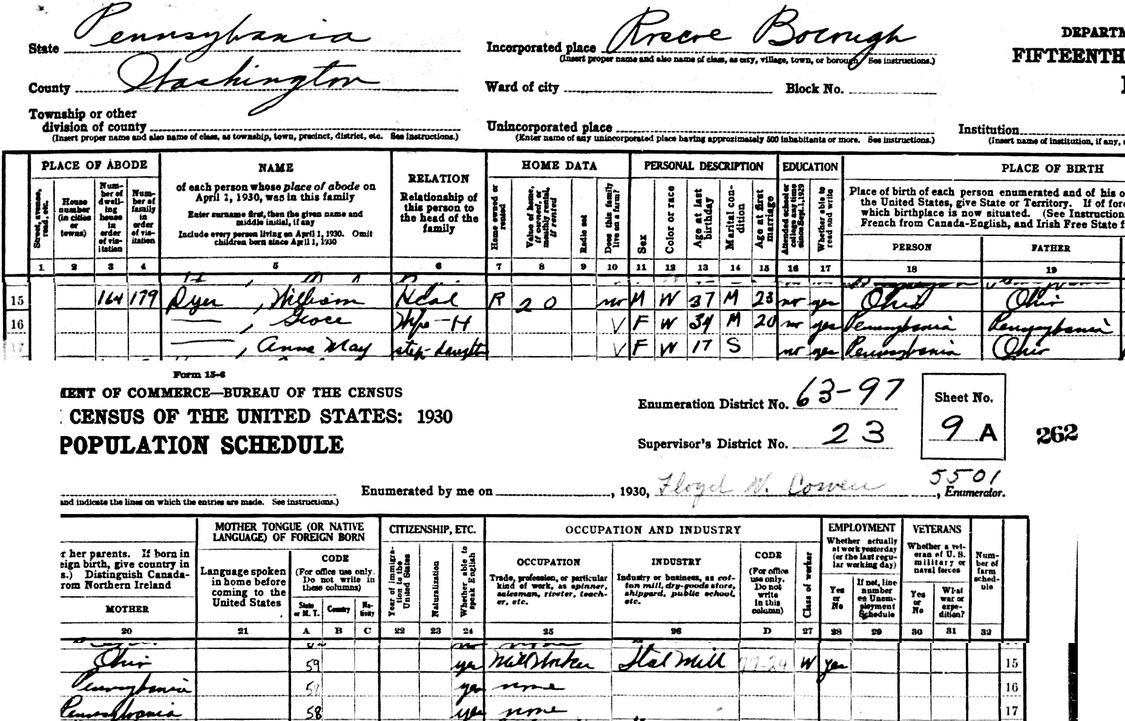 Source: Ancestry.com. 1930 United States Federal Census [database on-line]. Provo, UT, USA: Ancestry.com Operations Inc, 2002. United States of America, Bureau of the Census. Fifteenth Census of the United States, 1930. Washington, D.C.: National Archives and Records Administration, 1930. T626. Roscoe, Washington, Pennsylvania. William Dyer, Page: 9A; Enumeration District: 0097; FHL 2341897.