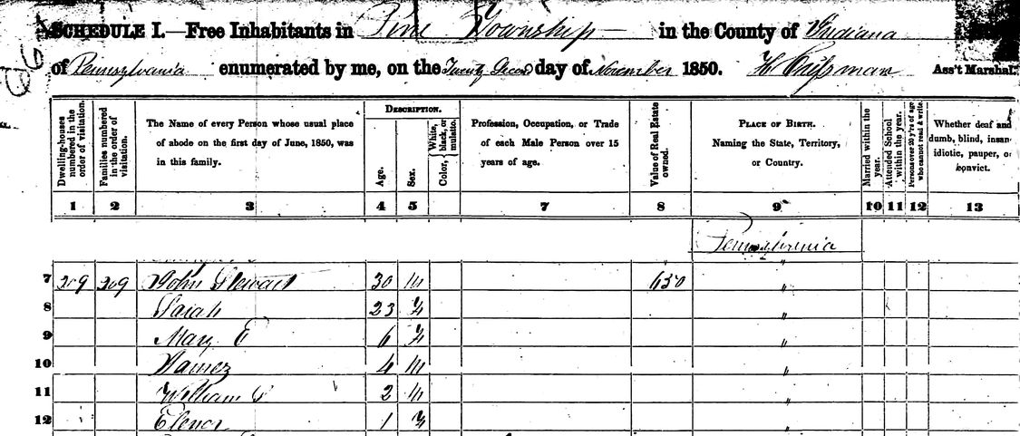 1850 federal census for the John Stewart [I00264] and Sarah Jane (Grow) Stewart [I00266] family.