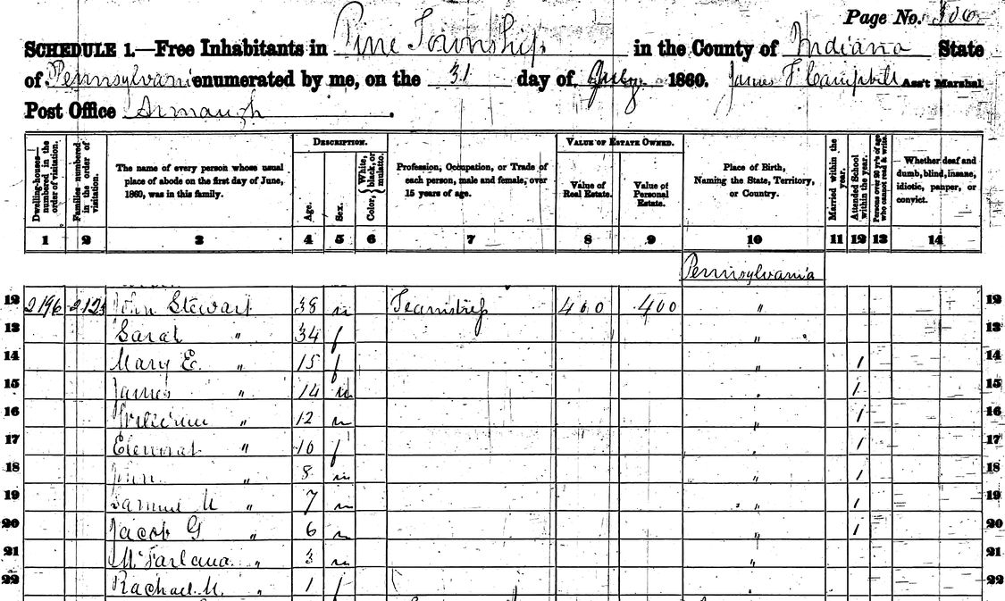 Source: 1860 United States Federal Census [database on-line]. Ancestry.com. Provo, UT, USA: Ancestry.com Operations, Inc., 2009. Images reproduced by FamilySearch. Pine, Indiana, Pennsylvania; Page: 275; Family History Library Film: 805117.