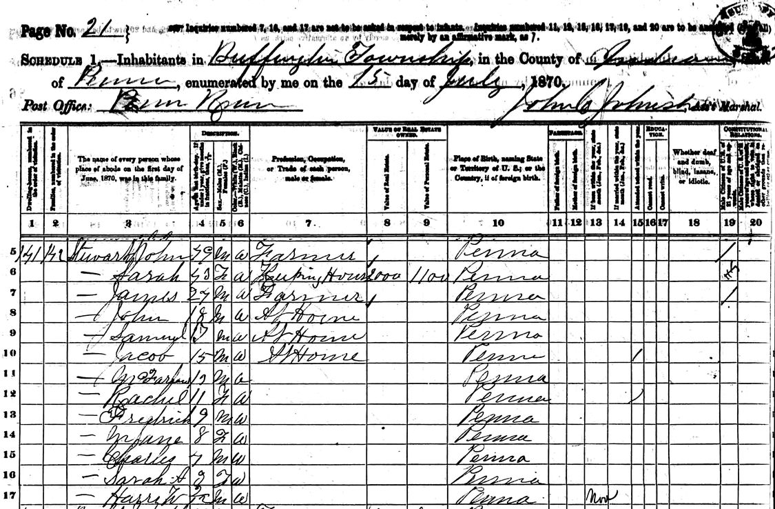 1870 federal census for the John Stewart [I00264] and Sarah Jane (Grow) Stewart [I00266] family.