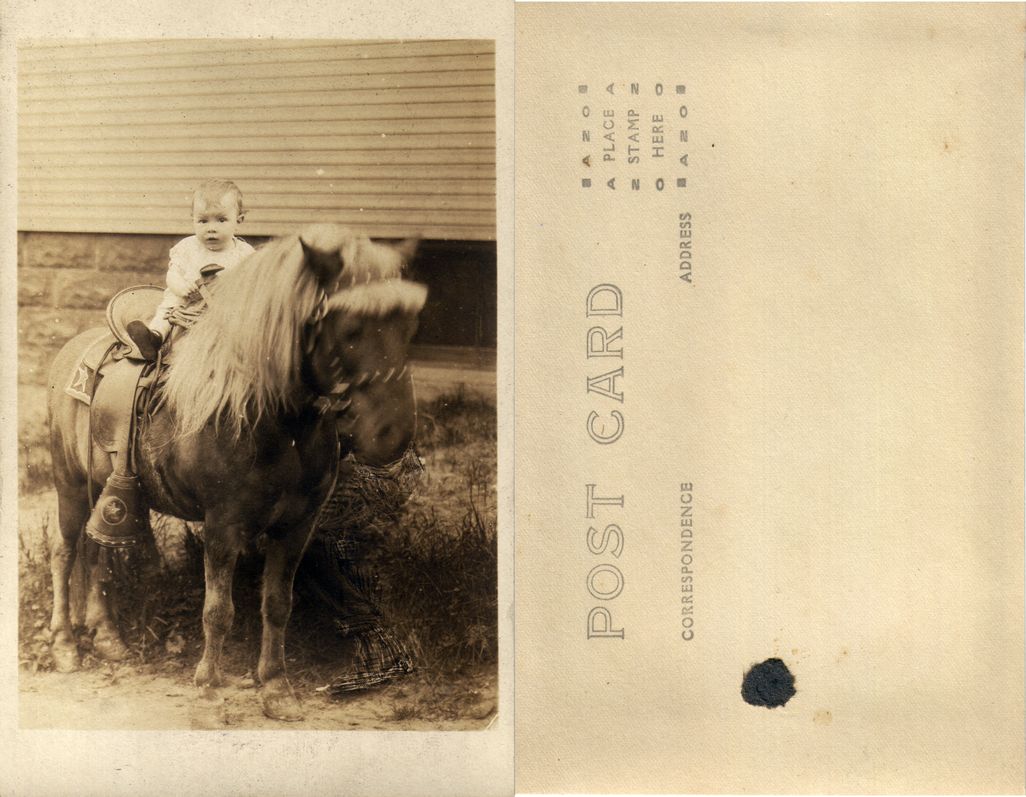 Postcard of Ruth Phyllis (Stewart) Voisin [00002] on a pony, circa 1928.