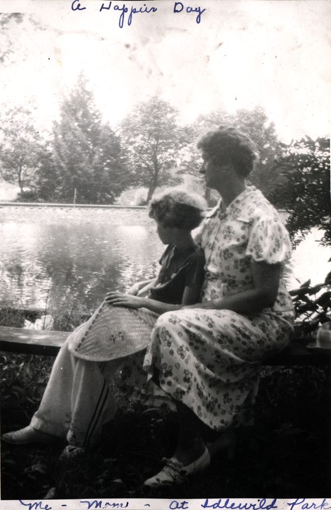 Ruth Phyllis (Stewart) Voisin [00002] with her mother Adelheid T. (Pohl) Stewart [00198] at Idlewild Park, Ligonier, Pennsylvania, circa 1937. Ruth titled the picture "A Happier Day" probably because it was a fond memory prior to her mother's illness and eventual death in 1943.