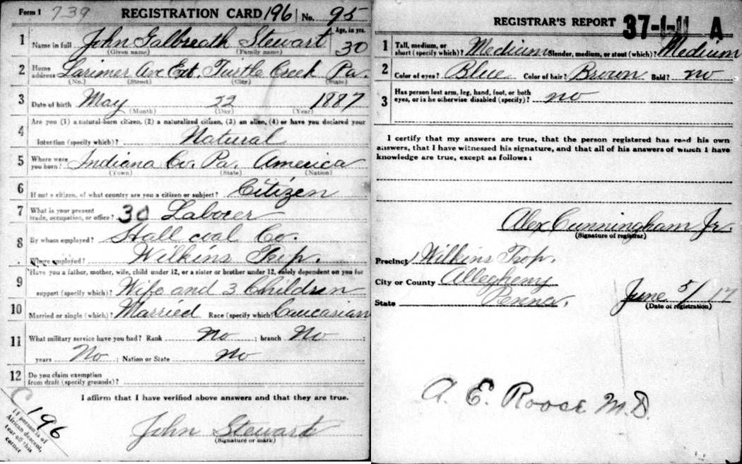 Source: "United States World War I Draft Registration Cards, 1917-1918," index and images, FamilySearch (https://familysearch.org : downloaded 2 April 2015), John Galbreath Stewart, 1917-1918; citing Allegheny County no 11, Pennsylvania, United States, NARA microfilm publication M1509 (Washington D.C.: National Archives and Records Administration, n.d.); FHL microfilm 1,852,387.