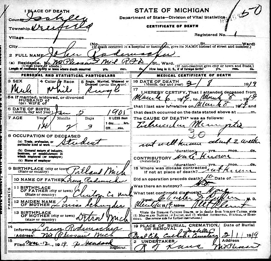 Source: Michigan Michigan History Foundation, "Death Records, 1897-1920," death certificates, Seeking Michigan (http://seekingmichigan.org/ : downloaded 30 October 2009), John Rademacher, March 8, 1919.