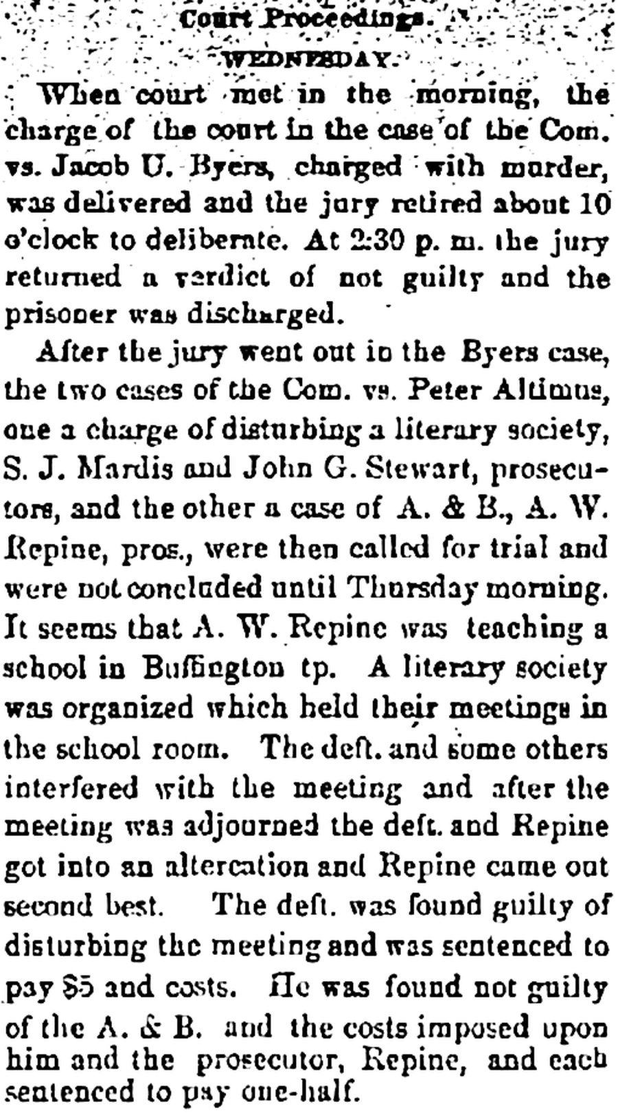 ...After the jury went out in the Byers case, the two cases of the Com. vs. Peter Altimus, one a charge of disturbing a literary society, S. J. Mardis and John G. Stewart, prosecutors, and the other a case of A. & B., A. W. Repine, pros., were then called for trial and were not concluded until Thursday morning. It seems that A. W. Repine was teaching a school in Buffington tp. A literary society was organized which held their meetings in the school room. The deft. and some others interfered with the meeting and after the meeting was adjourned the deft. and Repine got into an altercation and Repine came out second best. The deft. was found guilty of disturbing the meeting and was sentence to pay $5 and costs. He was found not guilty of the A. & B. and the costs imposed upon him and the prosecutor, Repine, and each sentenced to pay one-half.