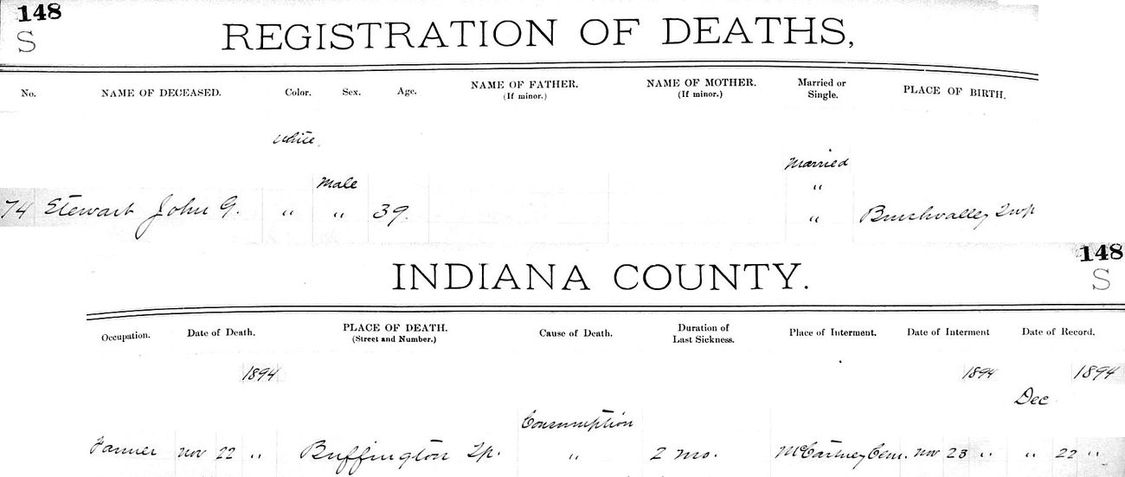 Death record for John Galbreath Stewart [I00235], who died 22 November 1894 of consumption (pulmonary tuberculosis).