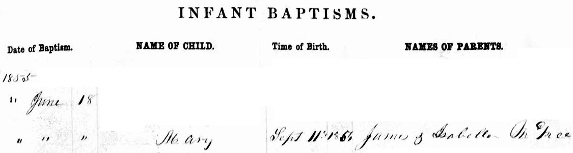 Baptism of Mary (McKee) Stewart [I00269], showing birth date of 11 September 1854.