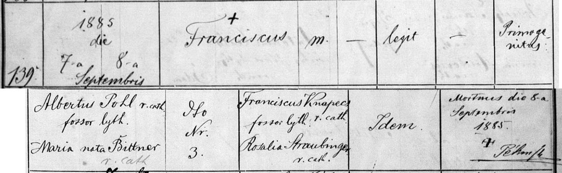 Birth record for Francis Pohl [I01933], showing parents Albert G. "Béla" Pohl [I00546] and Mária "Mary" (Bittner) Pohl [I00547]. He was born September 7, 1885, baptized September 8, and also died September 8, 1885.