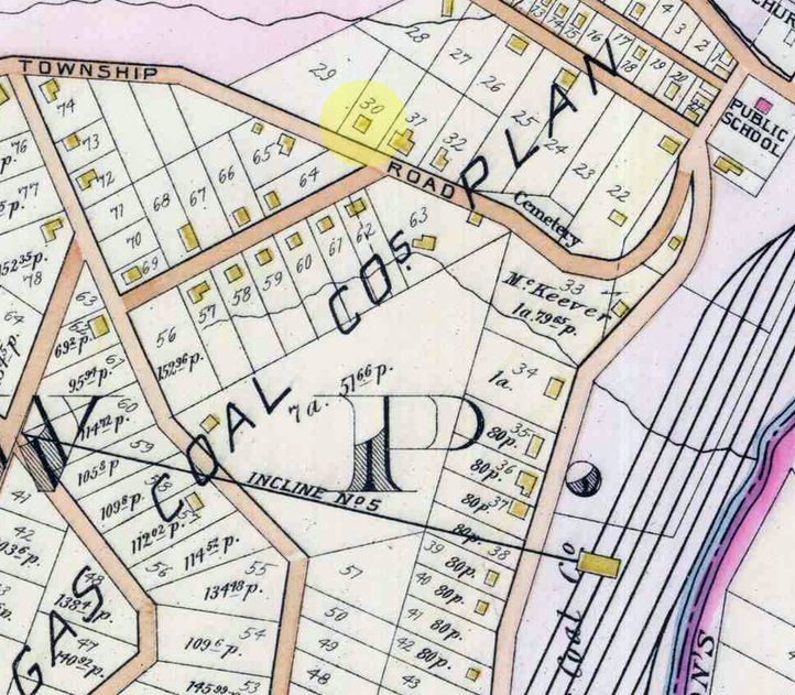 Detail from a 1903 plat map of Wilkins Township, Allegheny, Pennsylvania showing the location of the Albert and Mary Pohl family homestead, highlighted. The area was also known as #3 Hill. It is in the New York and Cleveland Gas Coal Company plan of lots. What is today known as Harrison Road was then known as Township Road.