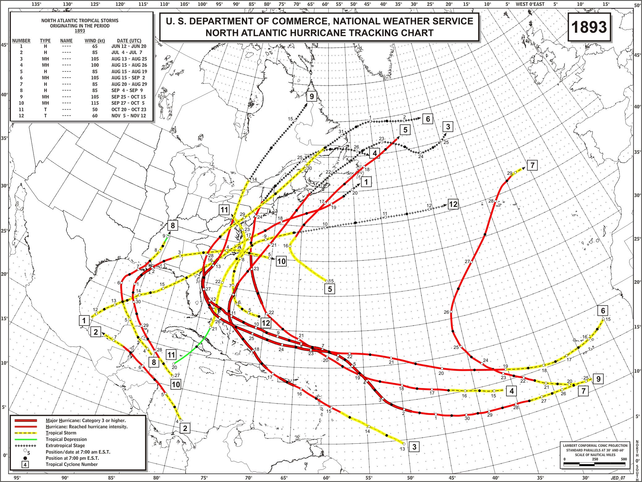 Source: National Oceanic and Atmospheric Administration, North Atlantic Hurricane Tracking Chart (Miami, Florida: Office of Oceanic and Atmospheric Research, n.d.); digital image, Atlantic Oceanographic and Meteorological Laboratory (http://www.aoml.noaa.gov/hrd/hurdat/Track-Maps.html : downloaded 26 November 2008), for the year 1893.