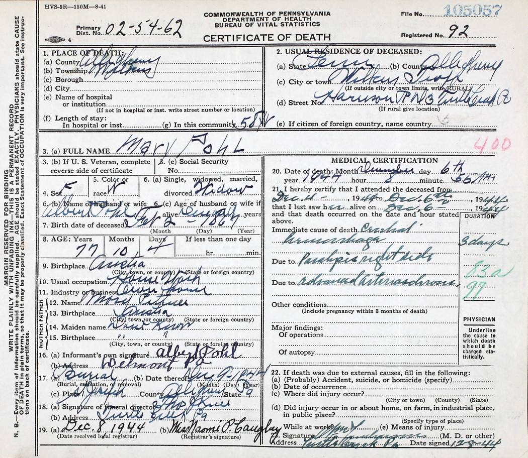 Source: Pennsylvania, Death Certificates, 1906-1963, 105057, Mary Pohl, 6 December 1944; database on-line, Ancestry.com Operations, Inc., Ancestry.com (http://Ancestry.com : downloaded 7 August 2014); Pennsylvania. Death certificates, 1906–1963. Series 11.90. Records of the Pennsylvania Department of Health, Record Group 11. Pennsylvania Historical and Museum Commission, Harrisburg, Pennsylvania.