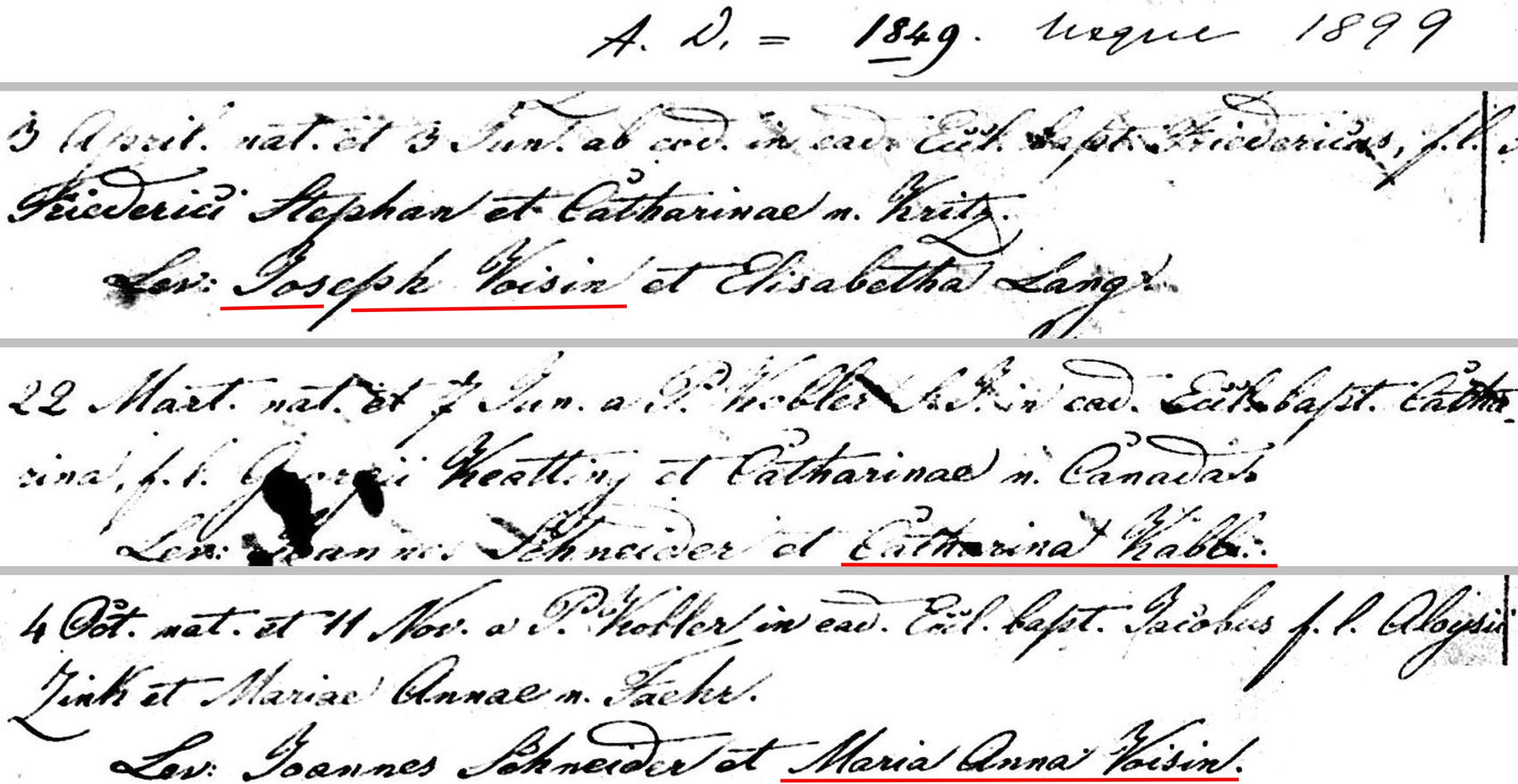A collection of three different baptisms showing baptismal sponsors of note. Joseph Voisin is presumed to be Joseph Voisin [I02181]. There were also Catherina Koebel [I03366], and Marie Anne (Voisin) Brinig [I02177].