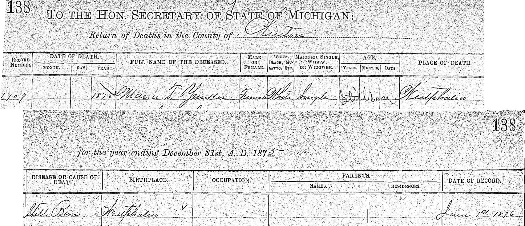 Source: Michigan, Michigan Deaths 1867-1897, Film 2363454; Digital GS 4207892; Image 481; Page 138; Record 1707, Maria T. Yuncker, 1875; Digital Images, FamilySearch and Genealogical Society of Utah, FamilySearch (http://FamilySearch.org : downloaded 7 November 2009).